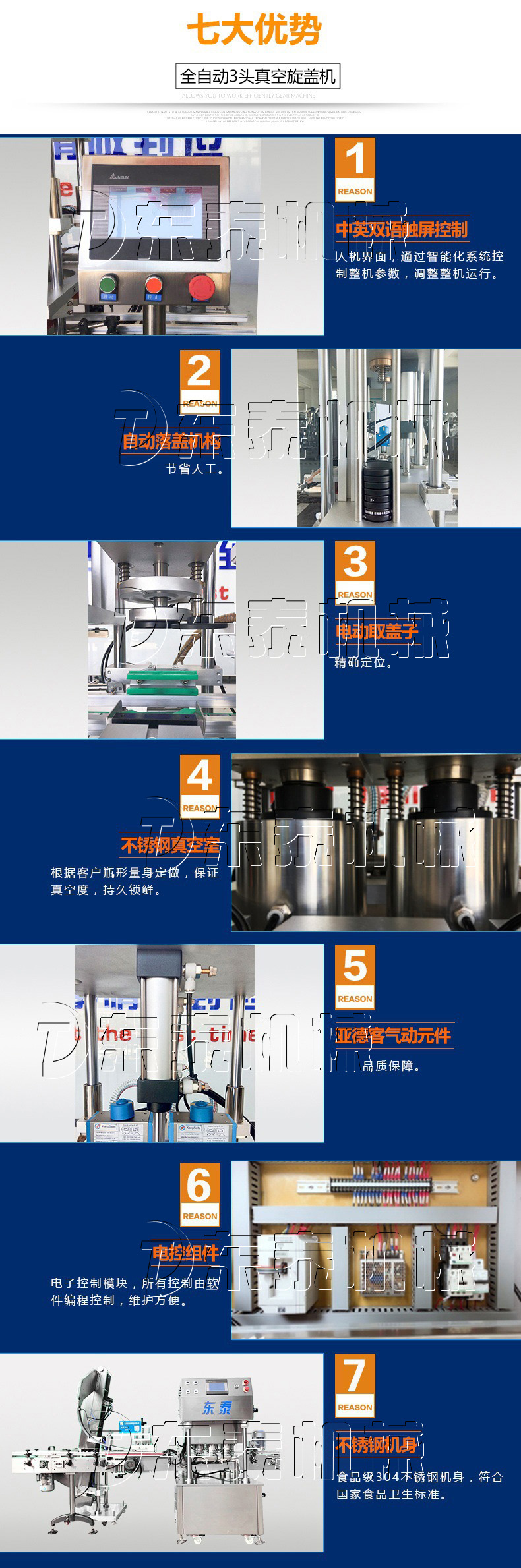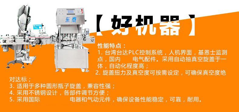 1.臺(tái)灣臺(tái)達(dá)PLC控制系統(tǒng),人機(jī)界面,基恩士檢測(cè)點(diǎn),國(guó)內(nèi)電氣配件。采用自動(dòng)抽真空旋蓋于一體,自動(dòng)化程度高;