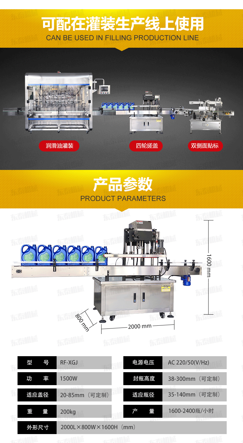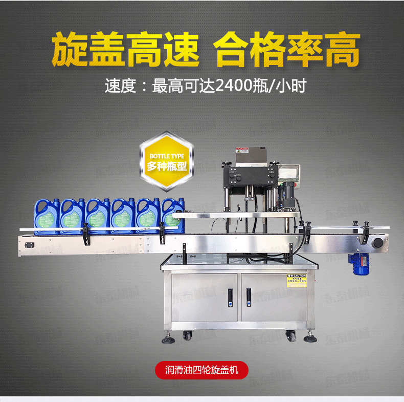 機(jī)油自動(dòng)搓蓋機(jī)電氣控制運(yùn)動(dòng),穩(wěn)定性強(qiáng);  設(shè)有定位裝置,旋蓋標(biāo)準(zhǔn),操作方便;  鎖蓋范圍寬,可鎖不同形狀規(guī)格的瓶蓋;解決了噴頭、泵頭、噴霧泵、手扣式噴頭旋蓋難的