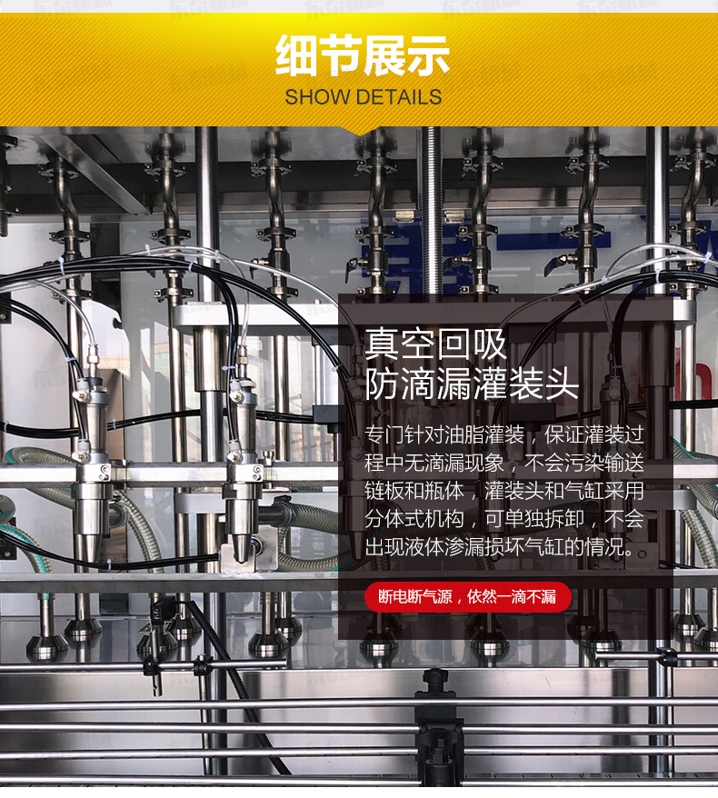 2、設(shè)計及真空回吸系統(tǒng)保證灌裝過程中無滴漏現(xiàn)象,不會污染輸送鏈板和瓶體。灌裝頭和氣缸采用分體式機構(gòu),可單獨拆卸,不會出現(xiàn)液體滲漏損壞氣缸的情況。亞德客氣缸經(jīng)久耐用,其他密封等配件使用標準件,更換維護簡單方便。