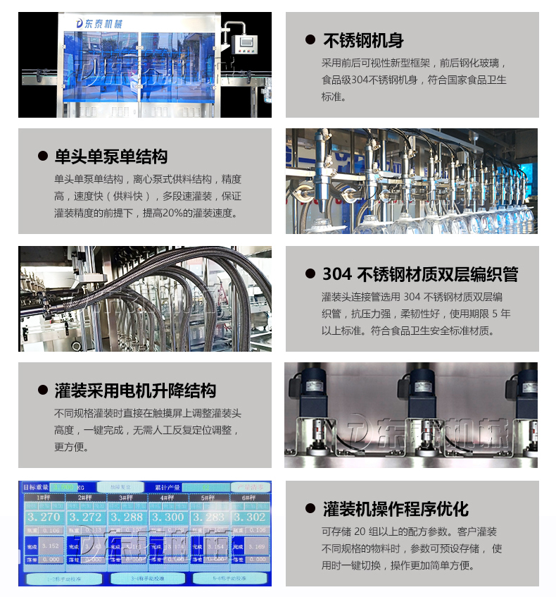 驅(qū)動方式更是通過伺服電機配合滾珠絲杠帶動相應(yīng)料缸內(nèi)的活塞做往復(fù)運動,從而讓料缸前腔產(chǎn)生負壓,以電機脈沖控制電機旋轉(zhuǎn)并控制活塞行程,從而調(diào)節(jié)灌裝量。驅(qū)動的方式應(yīng)用于容積柱塞式灌裝方式,這種灌裝方式和物料接觸部分均為不銹鋼316L 材質(zhì),灌裝過程中無污染,各物料轉(zhuǎn)換清洗方便,車間灌裝結(jié)束設(shè)備維護清洗便捷,大大優(yōu)于自流其他灌裝方式。氣缸驅(qū)動相比伺服驅(qū)動針對灌裝的計量范圍更加廣泛靈活,針對客戶多種灌裝規(guī)格的需求服驅(qū)動方式調(diào)整方便,僅需在觸摸屏上設(shè)置即可,一般出廠可以根據(jù)客戶常用規(guī)格直接寫入程序。伺服驅(qū)動方式灌裝速度快,不受氣壓的影響,灌裝速度可控。總之:伺服驅(qū)動方式在操作使用、精度誤差、整機調(diào)整、設(shè)備清洗、維護保養(yǎng)等方面更加方便客戶使用。并且我們公司有著優(yōu)質(zhì)的售后服務(wù)團隊為您以后的使用保駕護航。